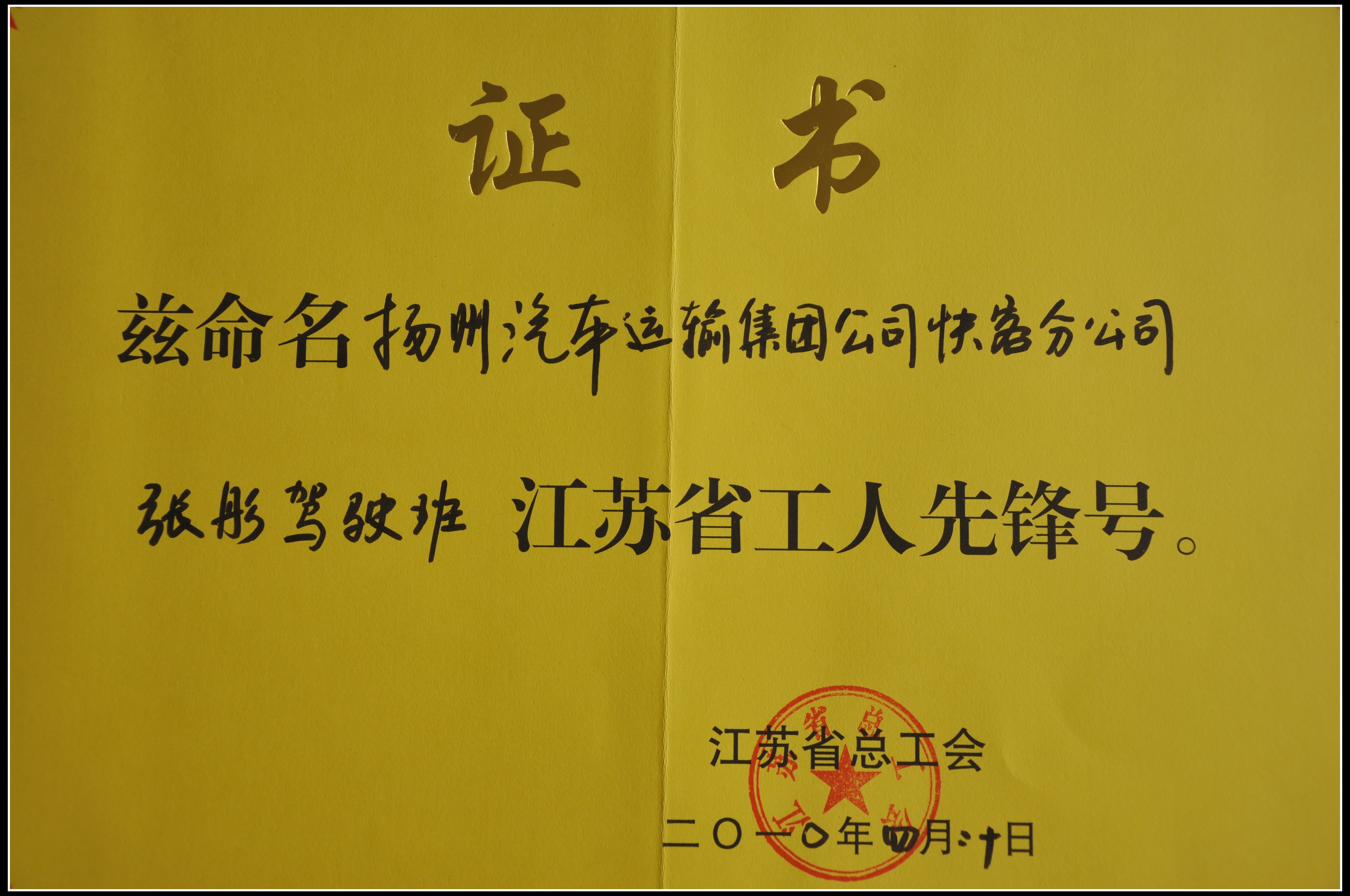 集團(tuán)公司快客分公司張彤駕駛班被江蘇省總工會(huì)評(píng)為工人先鋒號(hào)