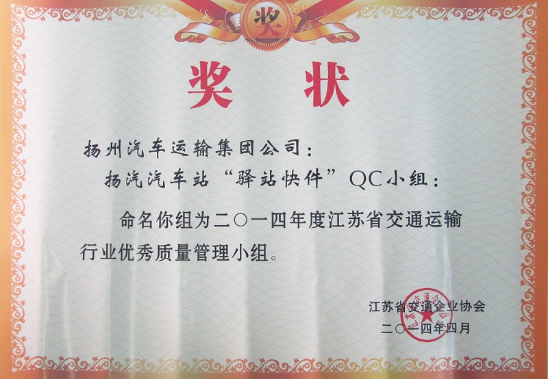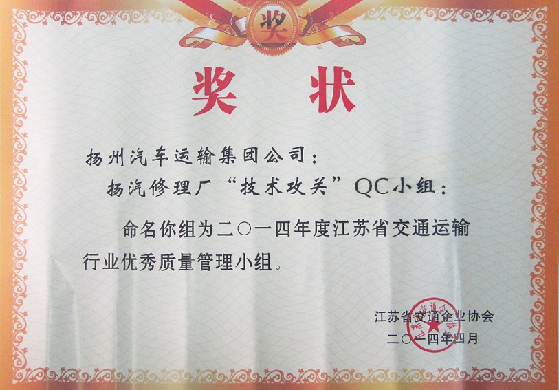 又訊:在此前進(jìn)行的江蘇省交通運(yùn)輸行業(yè)優(yōu)秀QC小組成果評選中,集團(tuán)公司被表彰為“省交通運(yùn)輸行業(yè)質(zhì)量管理小組活動(dòng)優(yōu)秀企業(yè)”,揚(yáng)州汽車站“驛站快件”QC小組(成果《降低到達(dá)庫收發(fā)貨的誤差率》)與修理廠“技術(shù)攻關(guān)”QC小組(成果《汽車變速箱小車式托架的研制》)被評為“省交通運(yùn)輸行業(yè)優(yōu)秀質(zhì)量管理小組”。