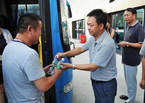 在西部客運(yùn)樞紐停車(chē)場(chǎng),凌董事長(zhǎng)與職工們親切交談,詢(xún)問(wèn)他們的工作狀態(tài)和身體狀況,并送上礦泉水和八寶粥。董事長(zhǎng)熱忱表示,企業(yè)發(fā)展離不開(kāi)一線(xiàn)工作人員的辛勤勞動(dòng),連續(xù)的高溫天氣給道路運(yùn)輸增加了很大壓力,一線(xiàn)職工戰(zhàn)高溫、斗酷暑,非常辛苦,為企業(yè)做出了很大貢獻(xiàn)。他希望廣大職工繼續(xù)發(fā)揚(yáng)艱苦奮斗的精神,確保車(chē)輛安全出行和準(zhǔn)點(diǎn)發(fā)車(chē),確保旅客平安往返。
