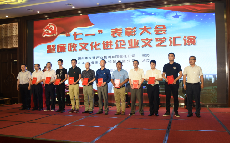 2018年是中國共產(chǎn)黨成立97周年,為隆重慶祝黨的生日,進一步激發(fā)黨員干部的使命感和責任感,同時深入推進“廉政文化”建設向企業(yè)延伸,提高黨員職工廉潔意識,6月28日,由交通產(chǎn)業(yè)集團主辦,揚汽集團承辦的“七一”表彰大會暨廉政文化進企業(yè)文藝匯演在二十四橋賓館隆重舉行。市國資委黨委副書記陳貴江、市紀委第十派駐紀檢組組長張正華、交通產(chǎn)業(yè)集團領(lǐng)導班子出席活動。系統(tǒng)內(nèi)各單位班子成員、基層支部書記、受表彰人員及黨員骨干代表參加活動。在莊嚴的國歌聲中,活動拉開了序幕。