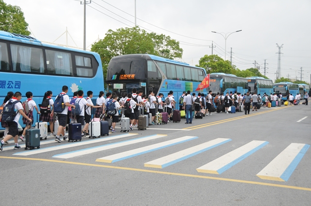 江蘇揚(yáng)汽集團(tuán)承擔(dān)了此次新生運(yùn)輸任務(wù),由旅游出租分公司牽頭,抽調(diào)快客、快鹿等各有車單位的大客車38輛,運(yùn)送樹(shù)人中學(xué)師生近2000人。