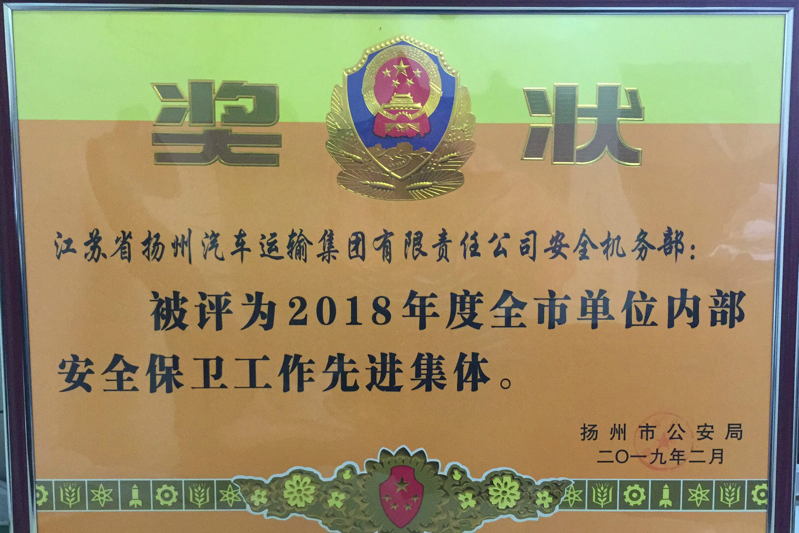 近日,揚汽集團(tuán)獲揚州市公安局表彰,集團(tuán)安全機務(wù)部被評為2018年度全市單位內(nèi)部安全保衛(wèi)工作先進(jìn)集體,馬繼賢被評為2018年度全市單位內(nèi)部安全保衛(wèi)工作先進(jìn)個人。