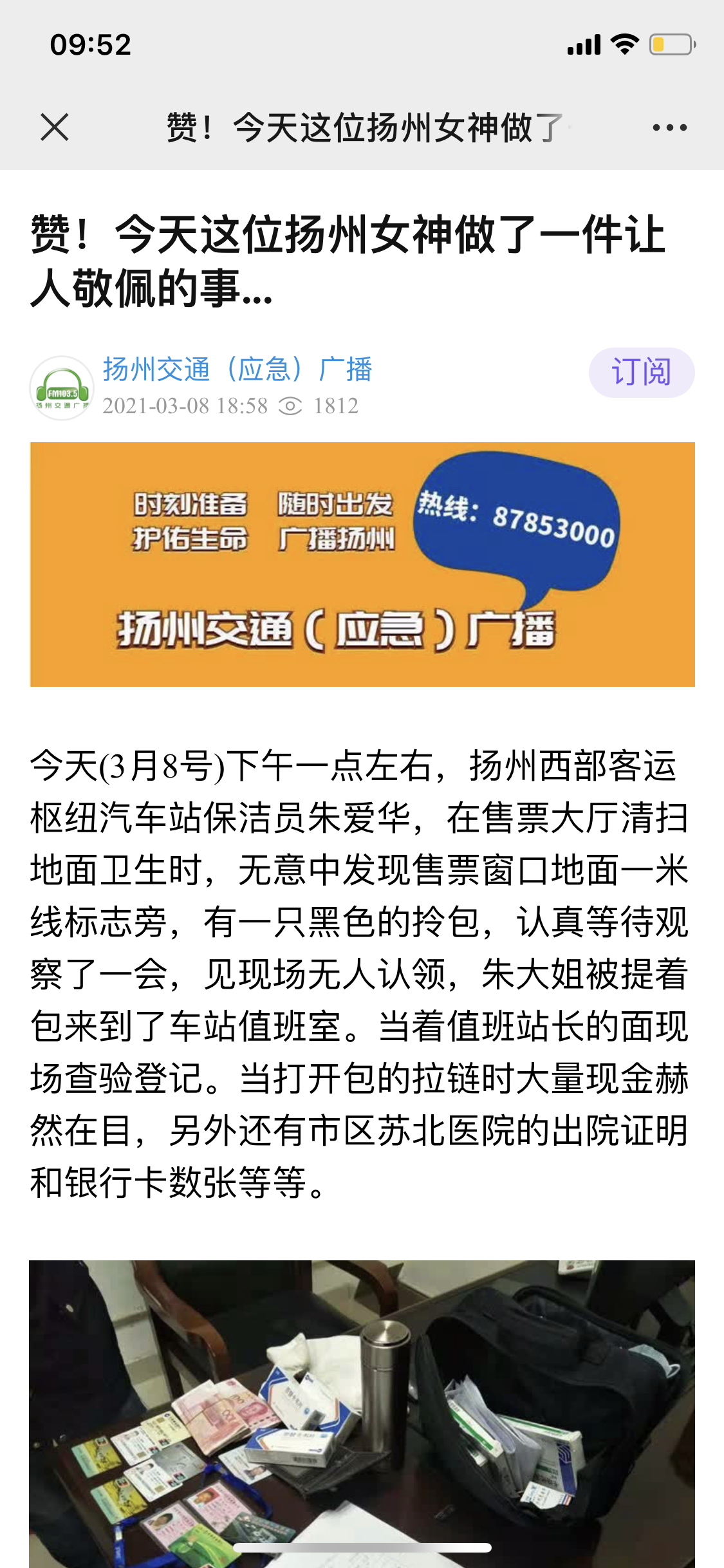 揚州站保潔員工拾金不昧,平凡舉動獲贊揚