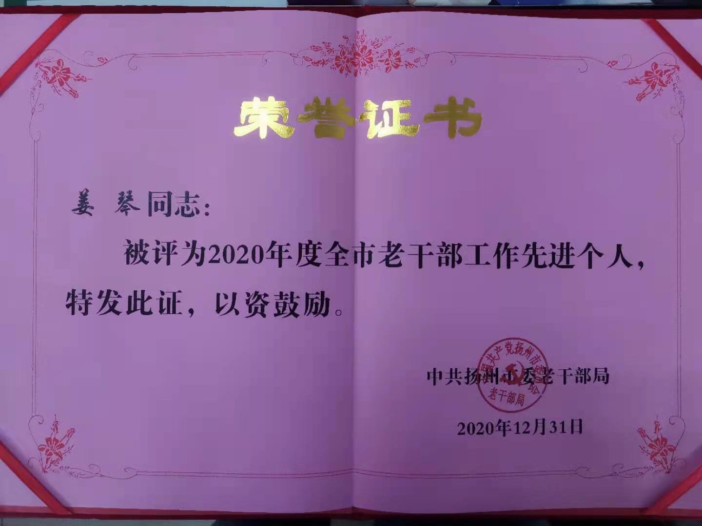 姜琴同志獲“2020年度全市老干部工作先進(jìn)個人”稱號