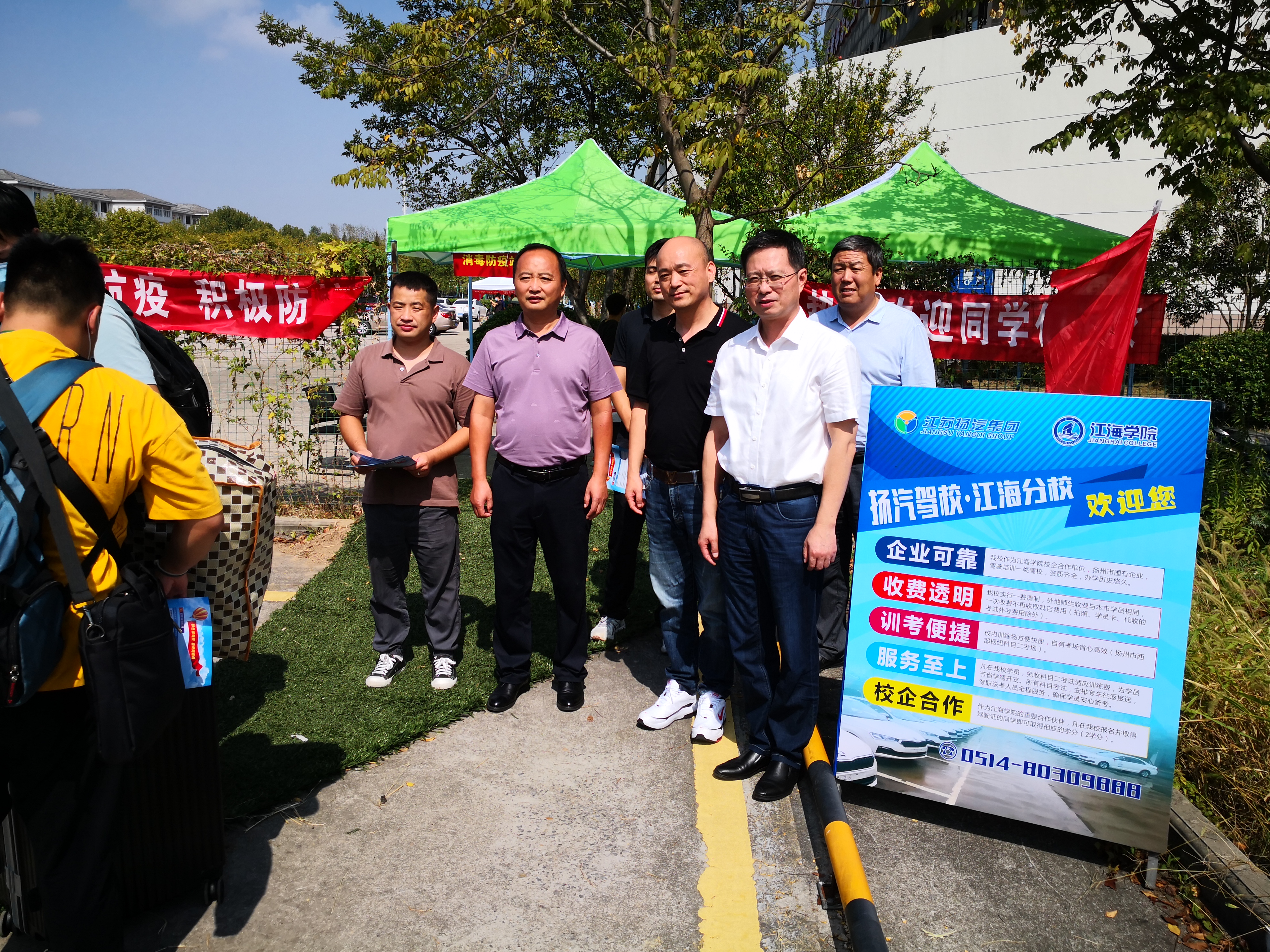 在江海學(xué)院咨詢點,揚汽駕校在校內(nèi)搭建了咨詢臺、遮陽棚等設(shè)施,并制作宣傳海報、宣傳冊等,F(xiàn)場工作人員嚴格按照學(xué)校疫情防控工作部署要求,落實落細各項措施,有序引導(dǎo)學(xué)生通過訓(xùn)練場內(nèi)設(shè)置的專用通道前往學(xué)校報到點,并協(xié)助學(xué)校工作人員查驗健康碼、測量體溫等,同時向?qū)W生及家長分發(fā)招生宣傳冊,詳細講解揚汽駕校收費透明、訓(xùn)考便捷、服務(wù)至上等優(yōu)勢,耐心解答學(xué)生及家長的學(xué)駕問題,為下一步更好地開展報名培訓(xùn)工作奠定了良好的基礎(chǔ)。
