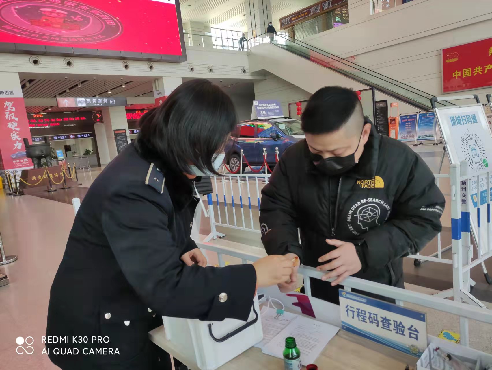 下午一點(diǎn)半,揚(yáng)州汽車站售票大廳門(mén)口,正在認(rèn)真查驗(yàn)行程碼的劉揚(yáng),看著對(duì)面遞身份證過(guò)來(lái)的一雙手,手上傷痕累累,手里握著一團(tuán)紙巾,紙巾上血跡斑斑,于是關(guān)切地詢問(wèn)起來(lái)。經(jīng)詢問(wèn)得知,原來(lái)旅客于先生是常州人,在揚(yáng)州出差三天了,估摸著今天的工作能夠忙完,想早點(diǎn)趕回常州,工作一結(jié)束,便從工作地點(diǎn)騎公共電動(dòng)車來(lái)?yè)P(yáng)州汽車站乘車,誰(shuí)知一個(gè)不小心,摔了一跤,羽絨服破了,手機(jī)摔壞了,兩只手也蹭破了好幾處,血不停地淌。