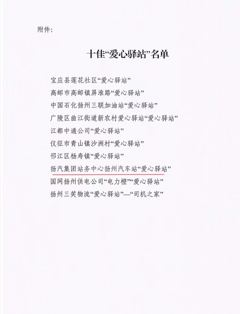近日,揚州市總工會印發(fā)《關(guān)于命名2022年度十佳“愛心驛站”的通報》,揚汽集團站務(wù)中心揚州汽車站榮獲十佳“愛心驛站”榮譽稱號。