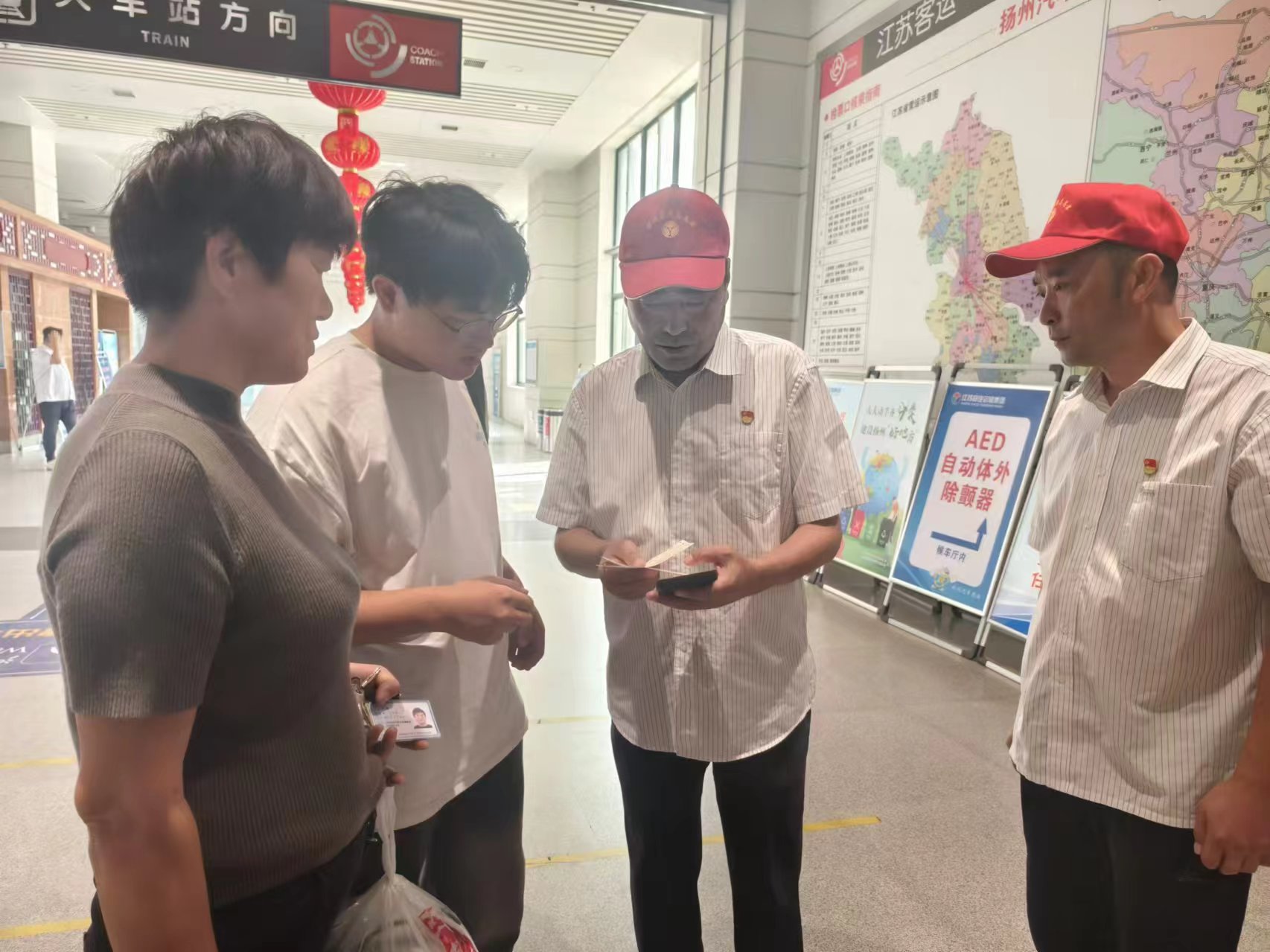 志愿者們有序在車站的售票廳、候車廳、安檢處、發(fā)車平臺等崗位為旅客提供文明勸導(dǎo)、秩序維護(hù)、行李搬運(yùn)、茶水服務(wù)等志愿服務(wù),并耐心解答旅客的每一個問題,細(xì)心指引旅客前往購票窗口、候車區(qū)、檢票口等關(guān)鍵位置,確保每一位旅客都能順利、愉快地踏上旅程。針對老弱病殘孕等重點(diǎn)旅游群體,志愿者們熱情為其提供“一對一”重點(diǎn)幫扶,全力保障旅客群體安全便捷出行。在揚(yáng)州汽車站候車大廳、汽車東站服務(wù)臺均設(shè)立了黨員示范崗,黨員志愿者們亮明身份,主動接受旅客監(jiān)督。